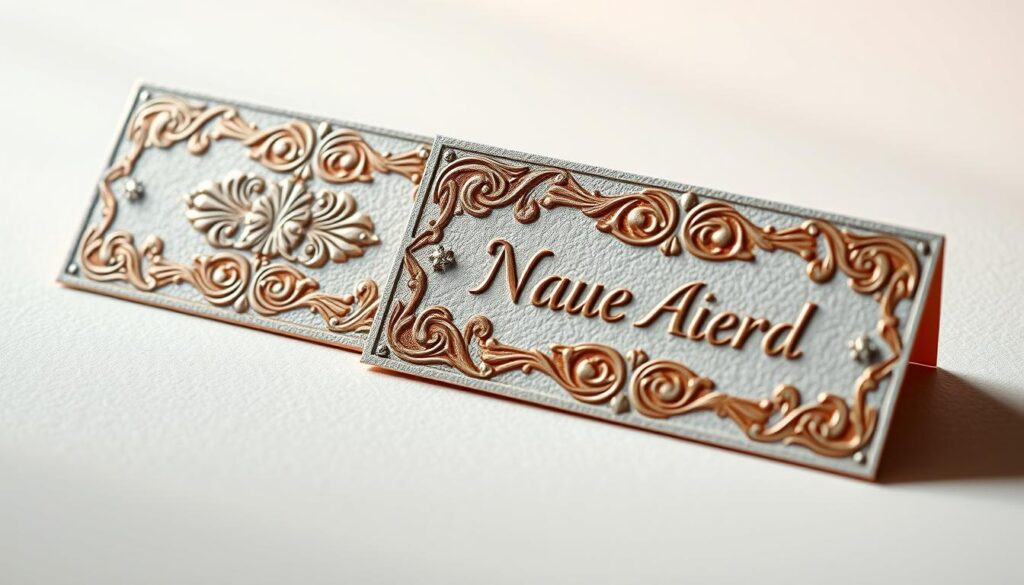 Making your name cards more elegant is easy with metallic foil stamping. This method adds a touch of luxury that grabs attention. It shows off your prestige.