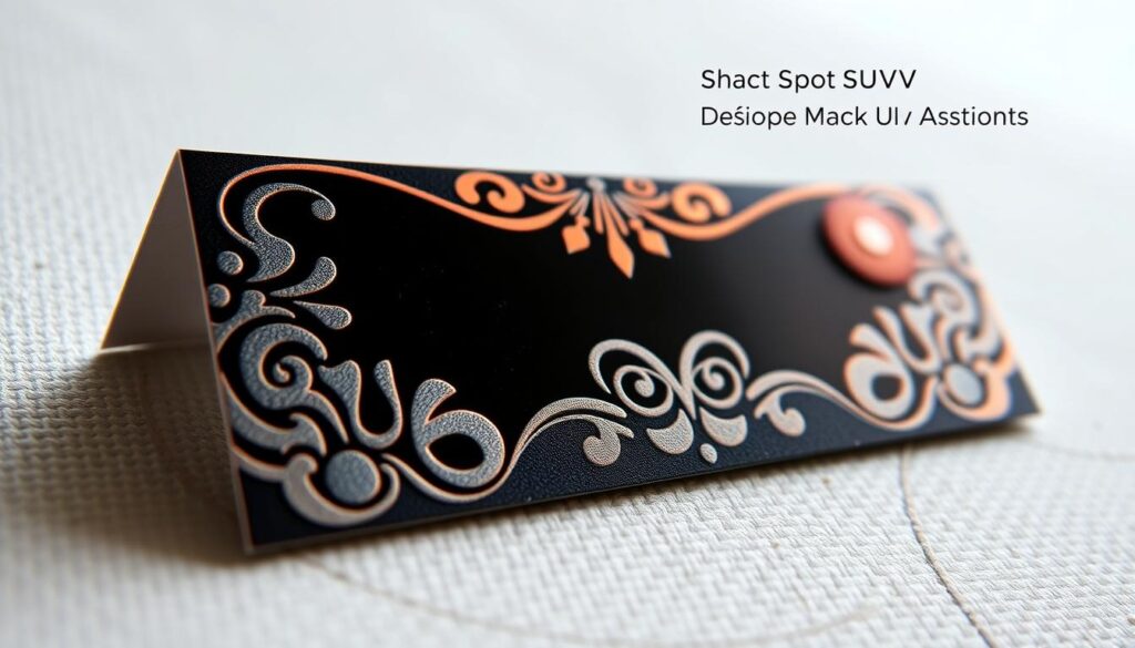 Die-cutting turns flat sheets into unique shapes. It can be simple or very detailed, making the card stand out. It’s a creative way to make name cards different from the usual rectangular ones.