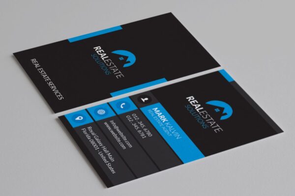 This design emphasizes clarity and professionalism, with dedicated sections for your name, title, and contact information. The black background with blue accents provides a timeless and elegant appeal, making this template suitable for residential real estate professionals who prioritize a modern and professional image.
